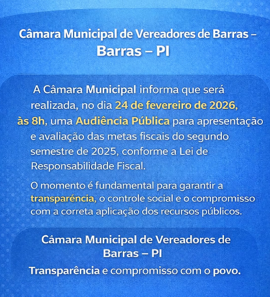 A Câmara Municipal de Vereadores de Barras promoverá, no dia 24 de fevereiro de 2026, às 8h, Audiência Pública destinada à apresentação e avaliação das metas fiscais referentes ao segundo semestre de 2025.
